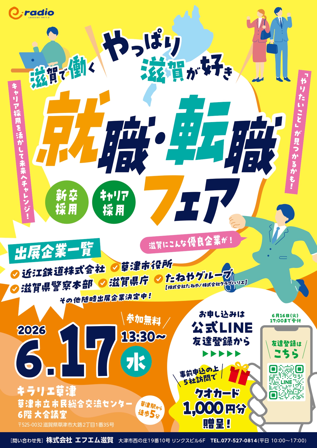 e-radioでは企業と求職者を繋ぐ複合メディア型のリクルートパッケージ「滋賀で働く就職・転職ガイド」を展開しています。ラジオCMでのブランディング、Webサイトでの企業紹介に加え合同説明会「滋賀で働く就職・転職フェア」を2026年6月17日(水)草津にて実施します。現在、新たな出会いを望む企業様の参加を募集中です。