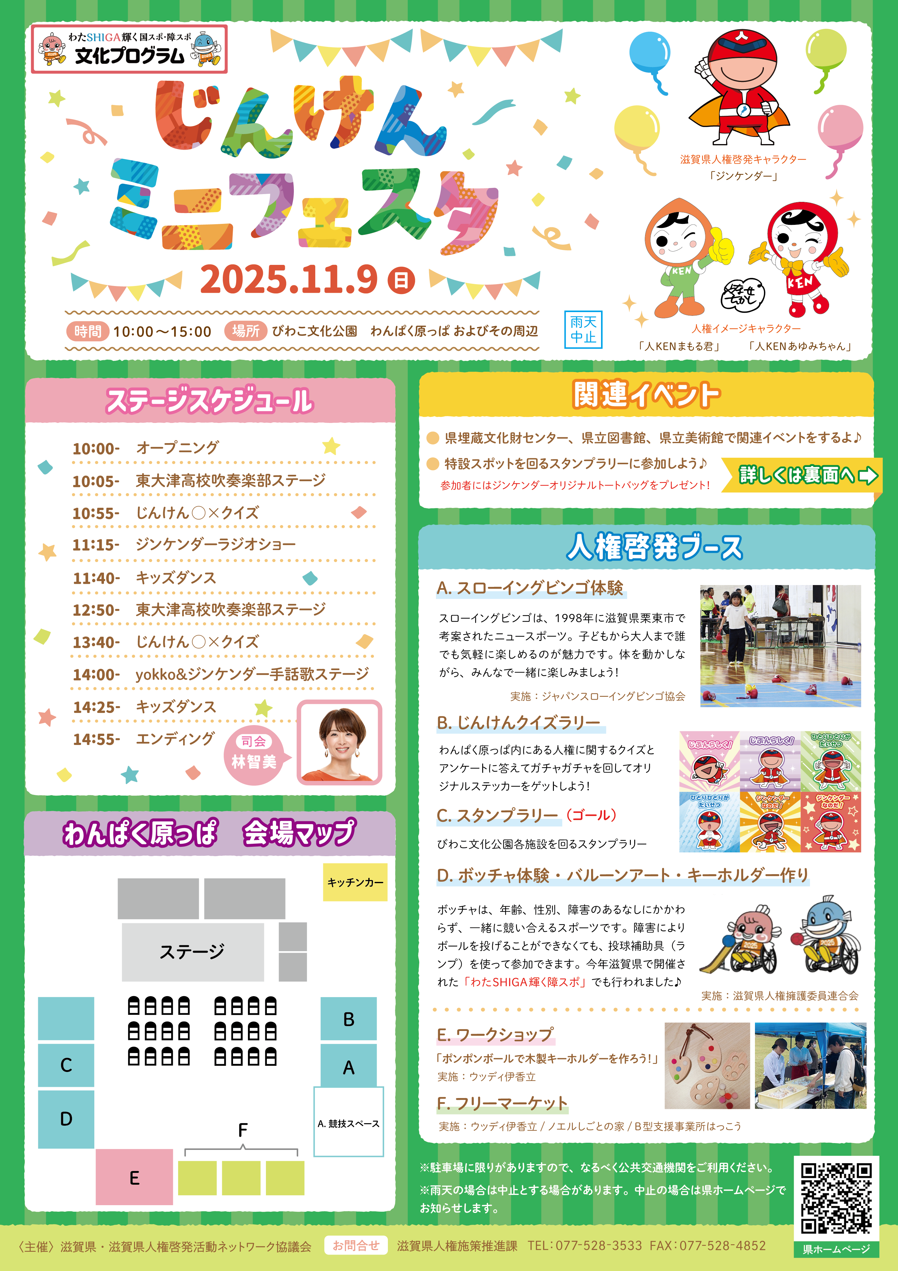 滋賀県では、人権について身近なところから考え、自ら行動するきっかけとしていただくことを目的に、 ミニフェスタを実施しています。 今回は11月9日 日曜日、「びわこ文化公園 わんぱく原っぱおよびその周辺」にて開催!
