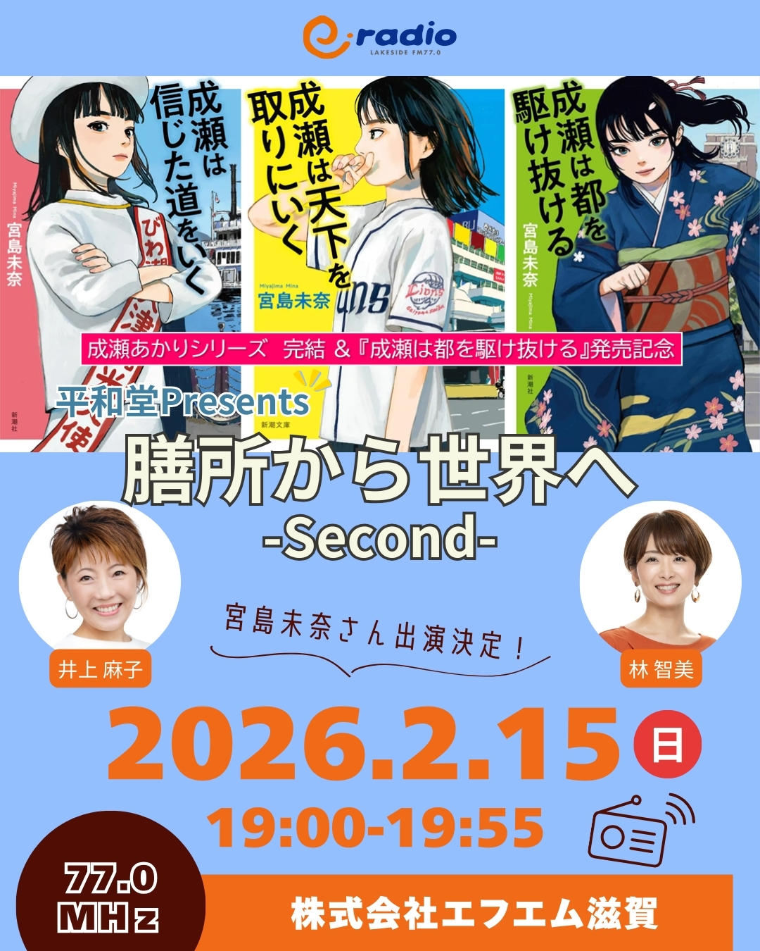 成瀬あかりシリーズ完結&『成瀬は都を駆け抜ける』発売記念「平和堂Presents 膳所から世界へ Second」の放送が決定いたしました。番組は2月15日(日)19:00~19:55オンエア!