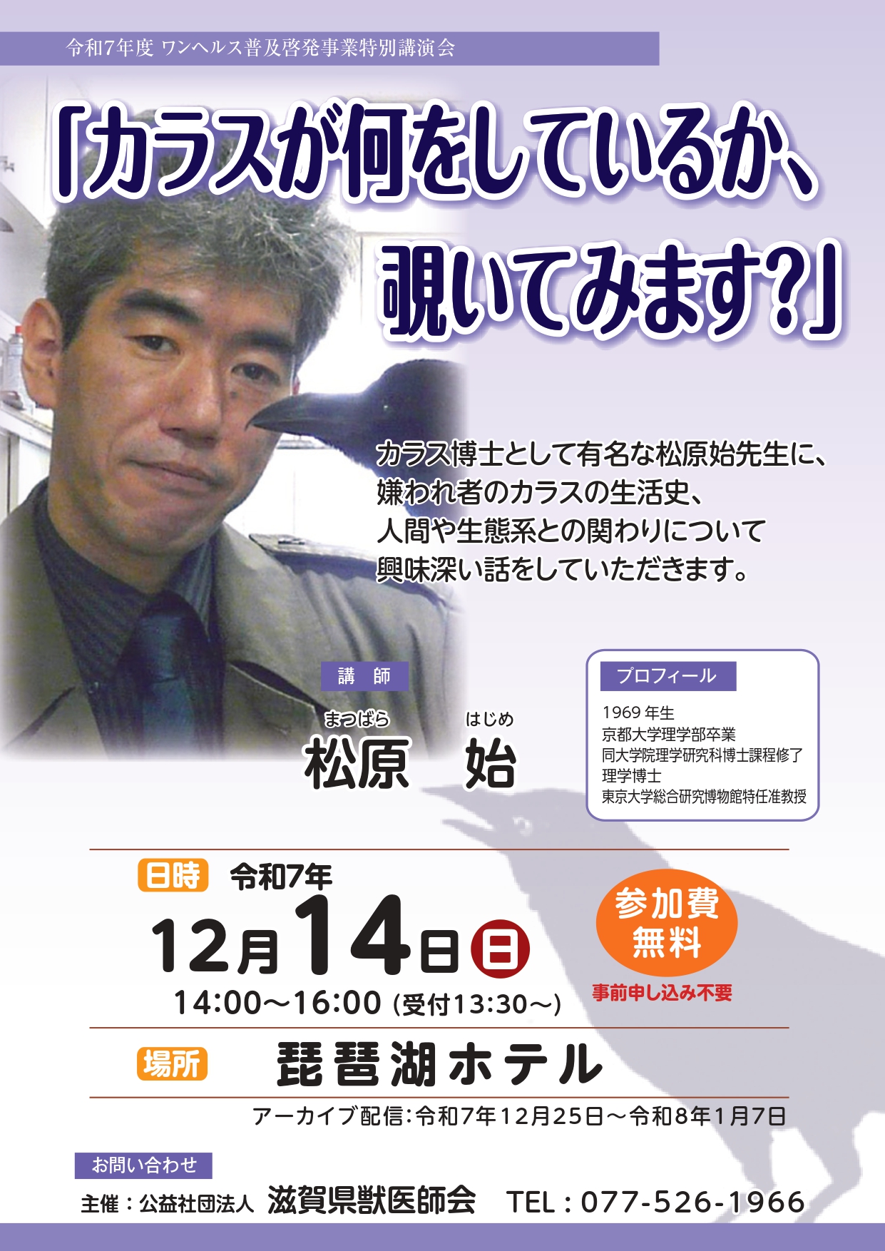 12月14日(日)、琵琶湖ホテルにて滋賀県獣医師会主催の一般公開講演会「カラスが何をしているか、覗いてみます?」を開催いたします。